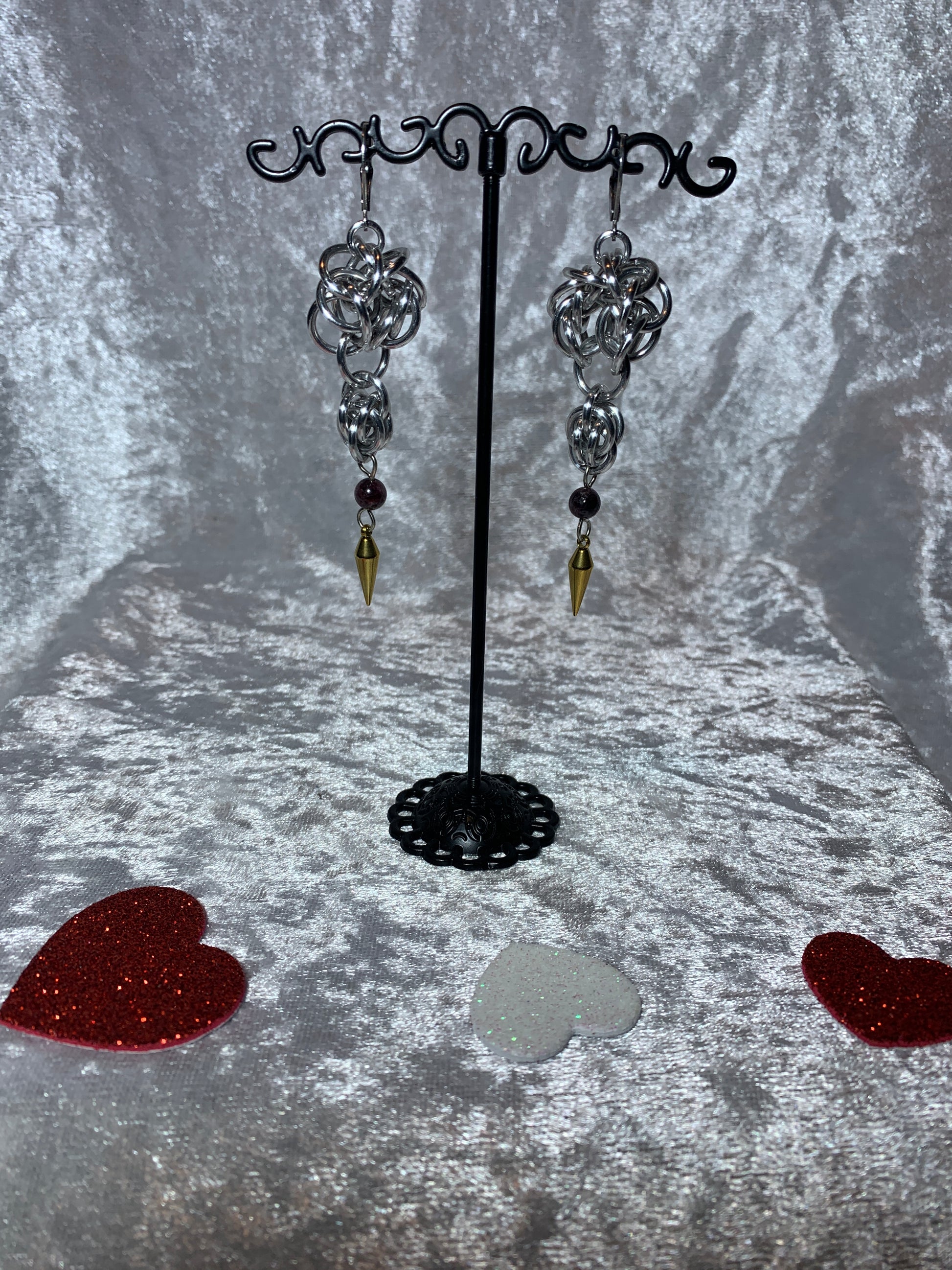 The Golden Silver earrings feature a stunning combination of the elegant half Persian chainmail weave and the delicate sweet pea chainmail weave. Adorned with natural garnet and gold plated stainless steel spikey cone pendants, these aluminum earrings exude sophistication. Completed with stainless steel earring clasps, they are both stylish and secure.