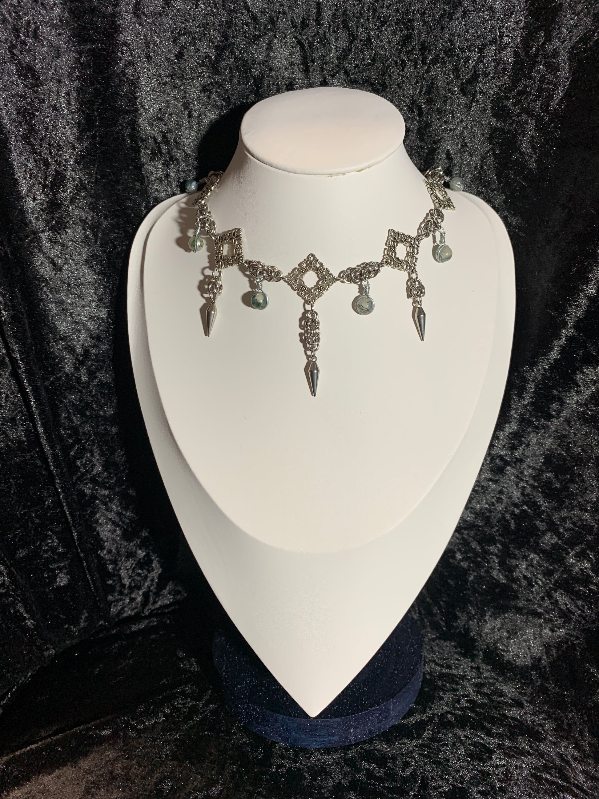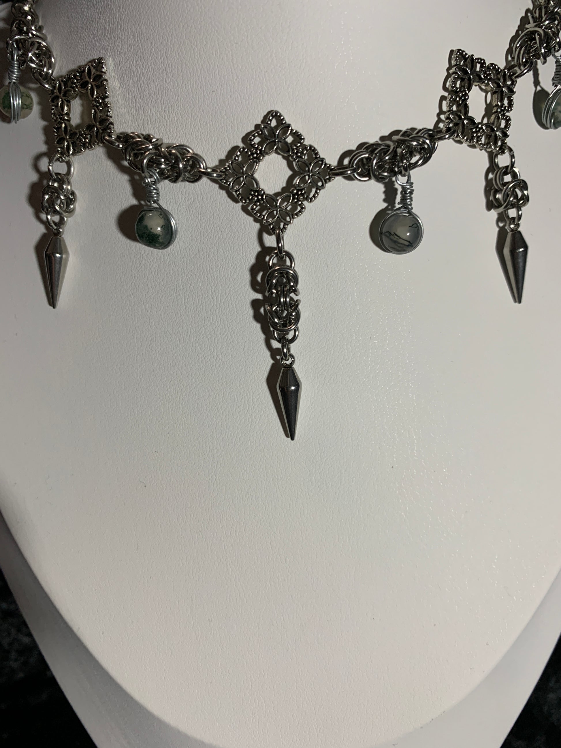 Get groovy, with Grooving In Moss, a stainless steel choker featuring flower pendants and wire wrapped, natural moss agate beads. Stay cool and collected no matter the weather or environment with the natural healing properties of moss agate.