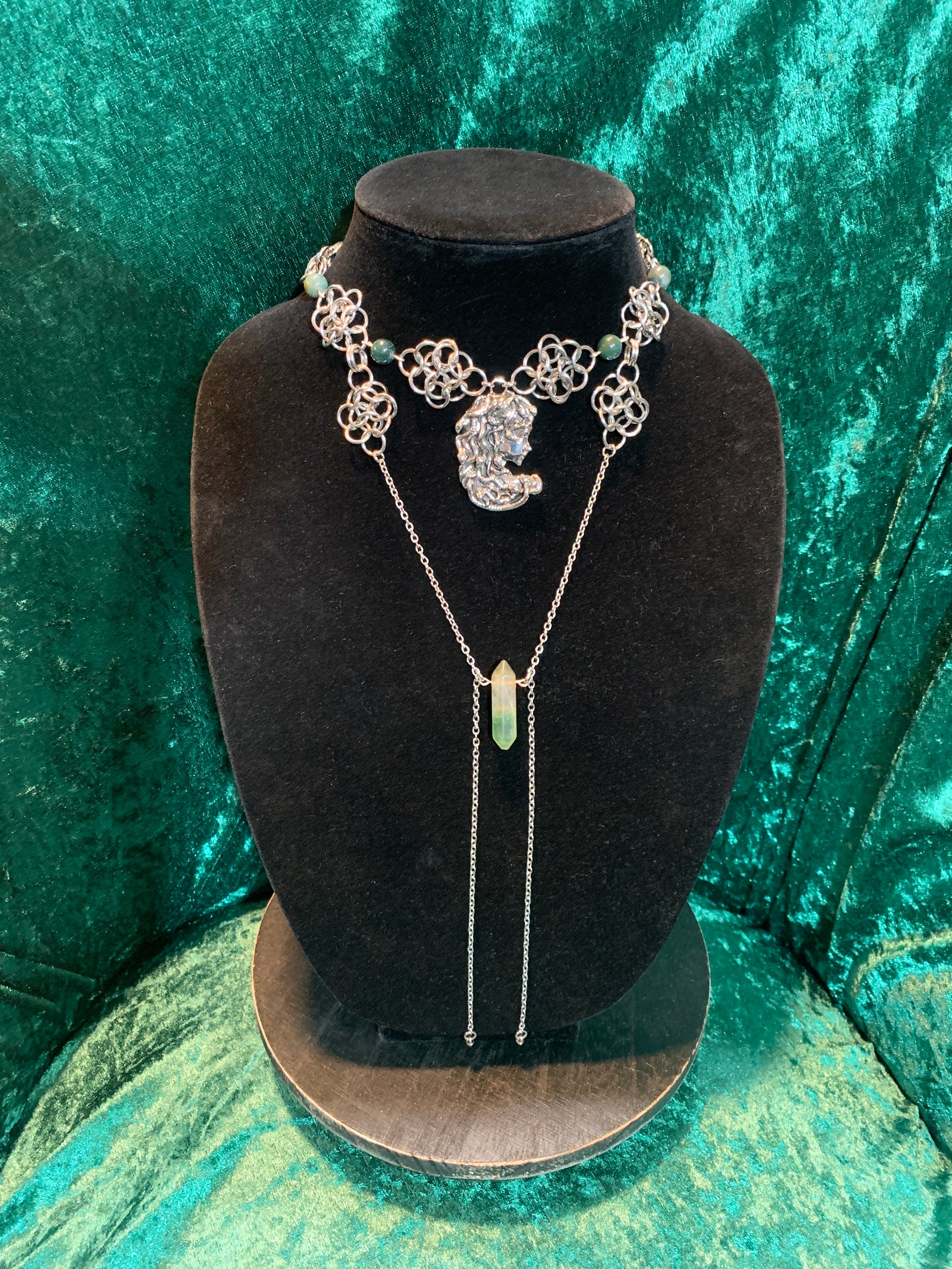 Introducing Medusa's Spirit, a stainless steel choker infused with the power of Medusa herself. Adorned with rosettes chainmail weave, natural moss agate beads for self esteem, and a rainbow fluorite pendant for relationship harmony. Get ready to turn heads and cultivate meaningful connections!