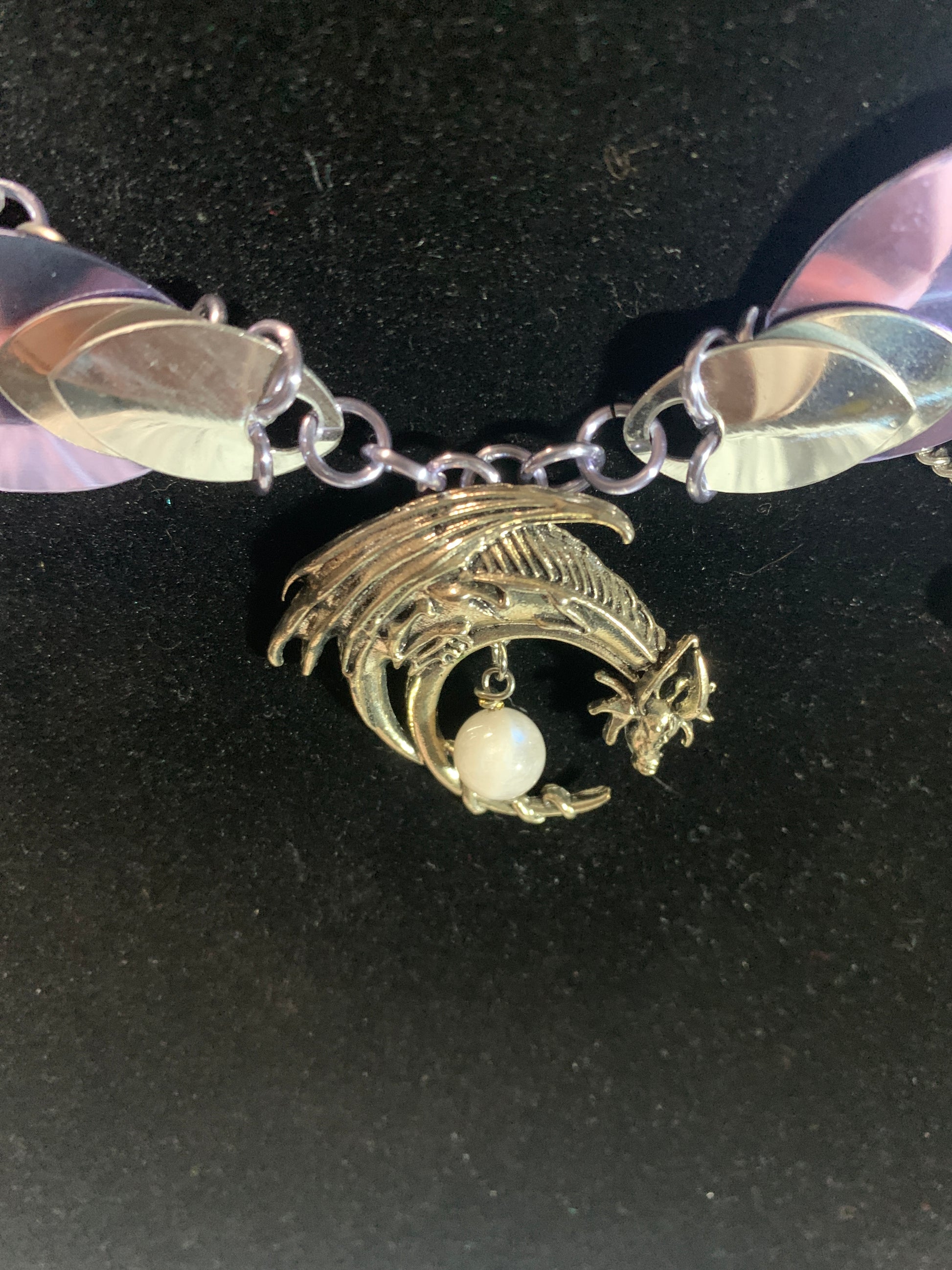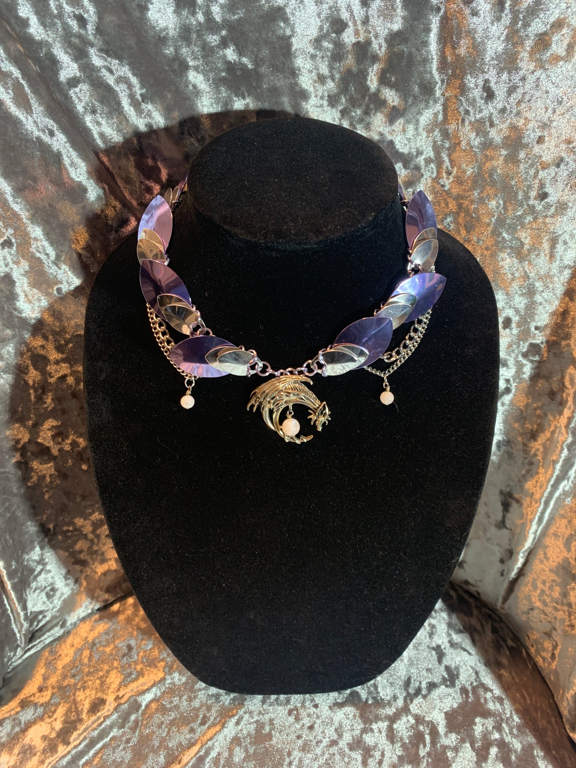 Introducing the Moonstone Dragon choker, crafted from lightweight aluminum, featuring a striking light purple and silver scalemail design accented with delicate chains. Adorned with natural rainbow moonstones, known for promoting calmness, hope, and new beginnings. Unleash your inner serenity and let your dreams take flight.