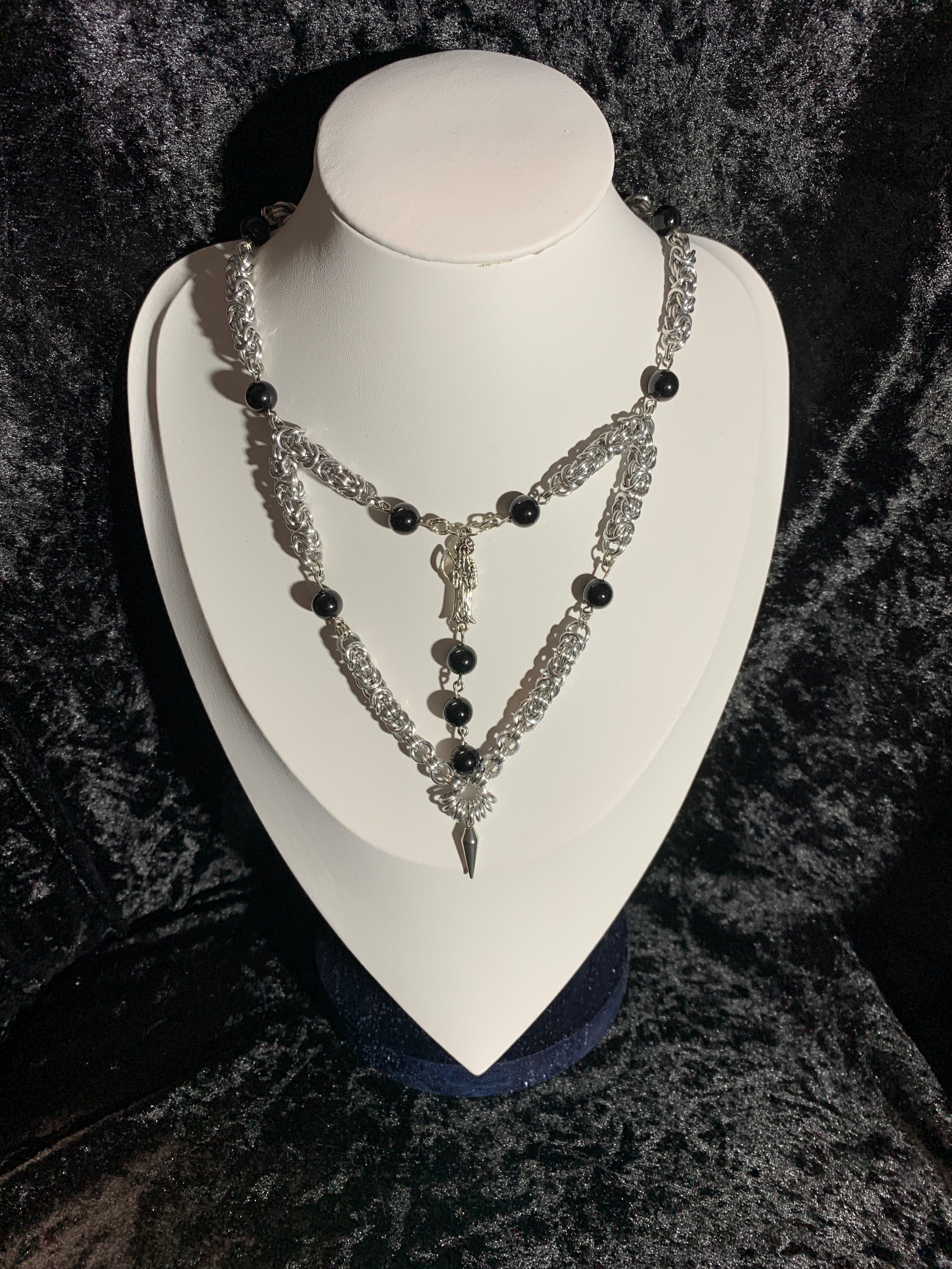 Show your devotion to Santa Muerte with this unique aluminum Byzantine chainmail rosary choker. Featuring a small Santa Muerte pendant and natural black onyx beads, it's a powerful reminder of the afterlife and the importance of living life to the fullest. The black onyx beads also offer protection and help release negative emotions. Pay tribute to loved ones, past and present, with style and reverence.