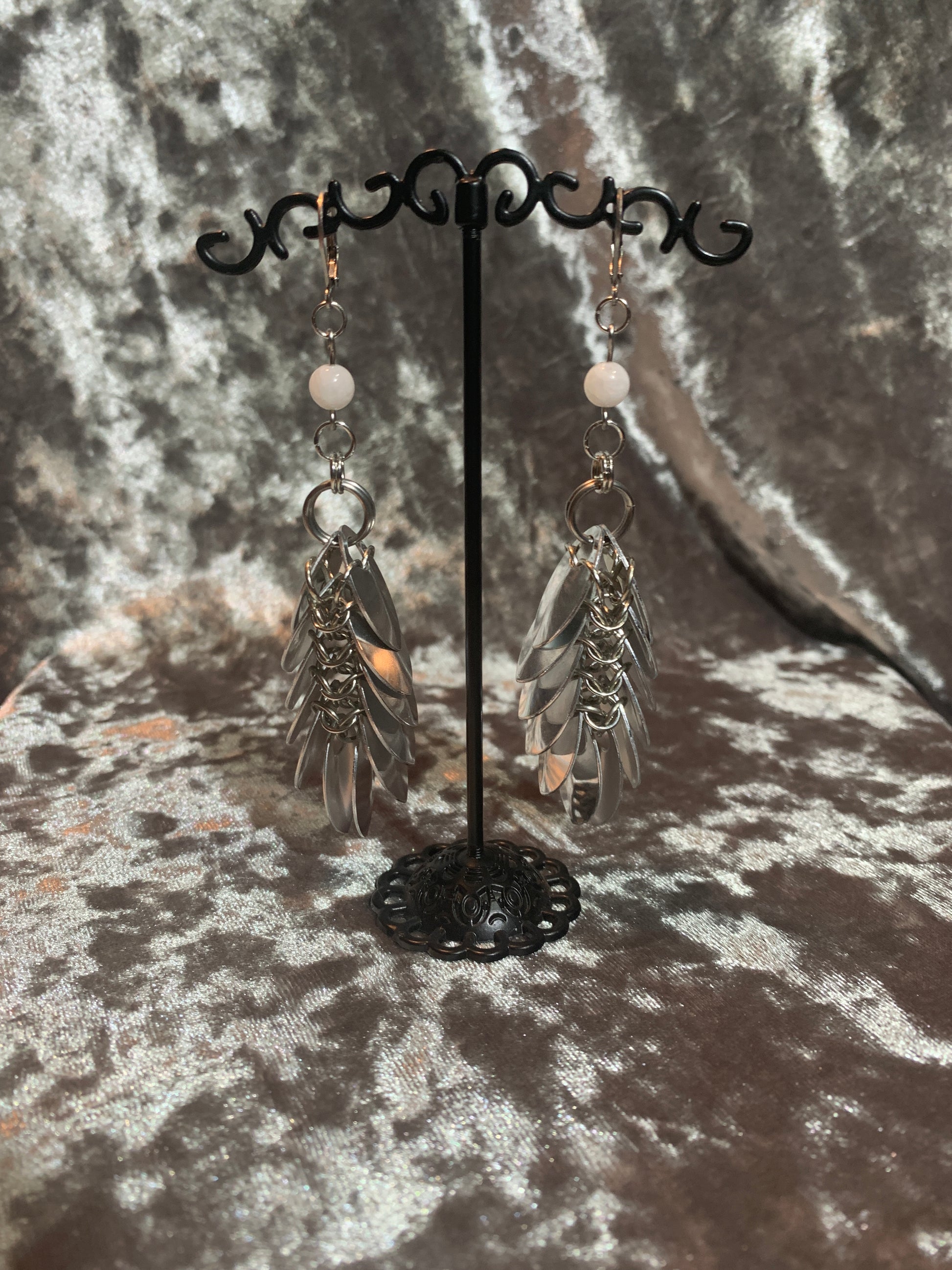 Transform your style with a pair of Scale Tails. With bright aluminum scalemail earrings adorned with natural rainbow moonstones. Put together with stainless steel, earring clasps. Feel the calming energy and embrace new beginnings with these unique earrings. Don't worry, they won't give you lucid dreams...unless you want them to.