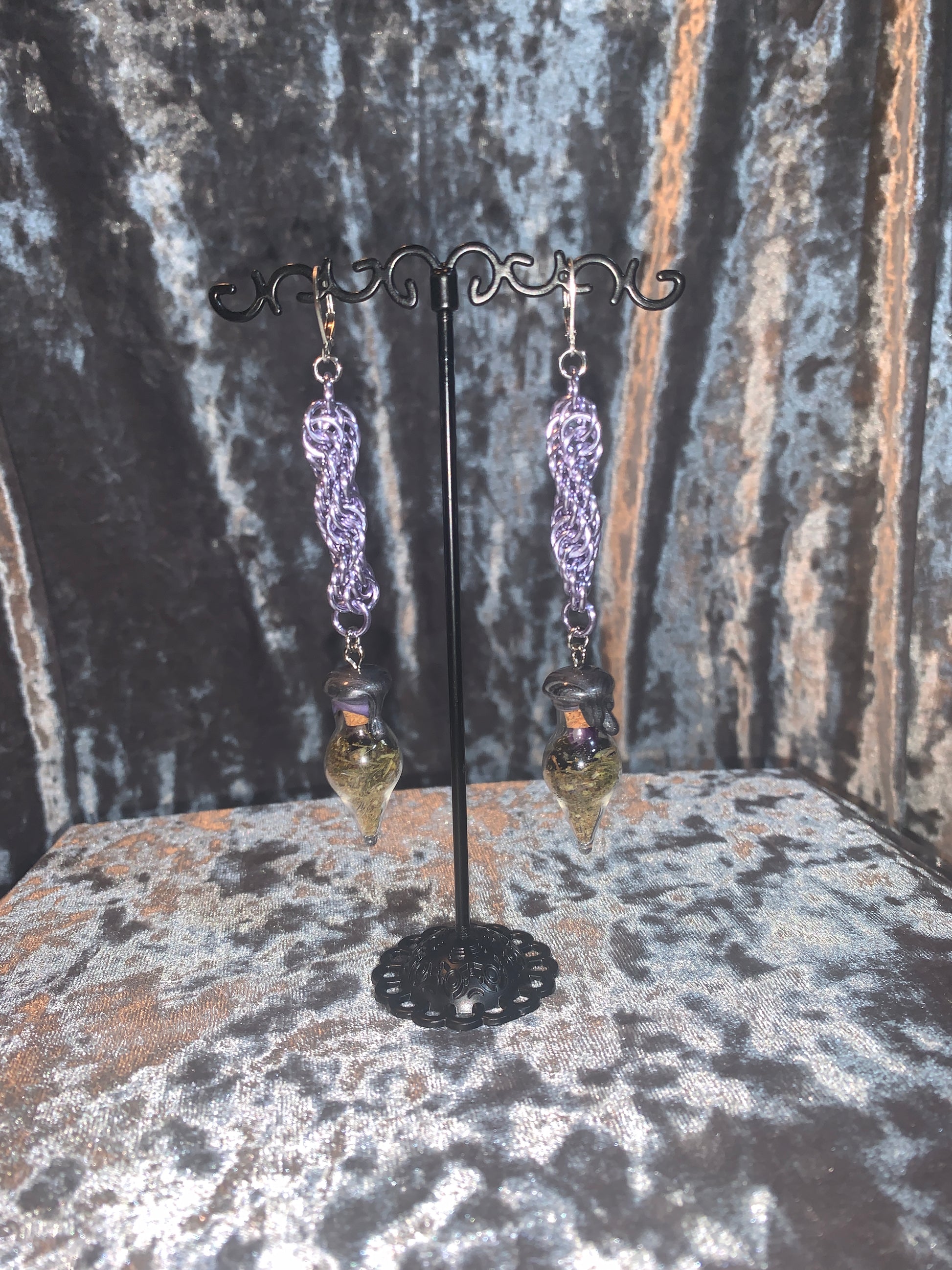 Introducing the Spiral Morado Forest, a playful piece of jewelry that combines aluminum and light purple into a stunning spiral chainmail weave. With incantation earrings and the added benefits of eucalyptus and Rosemary herbs for protection and spiritual healing, this necklace also features natural amethyst and black obsidian chips. All sealed with wax. Protect and heal yourself in style!