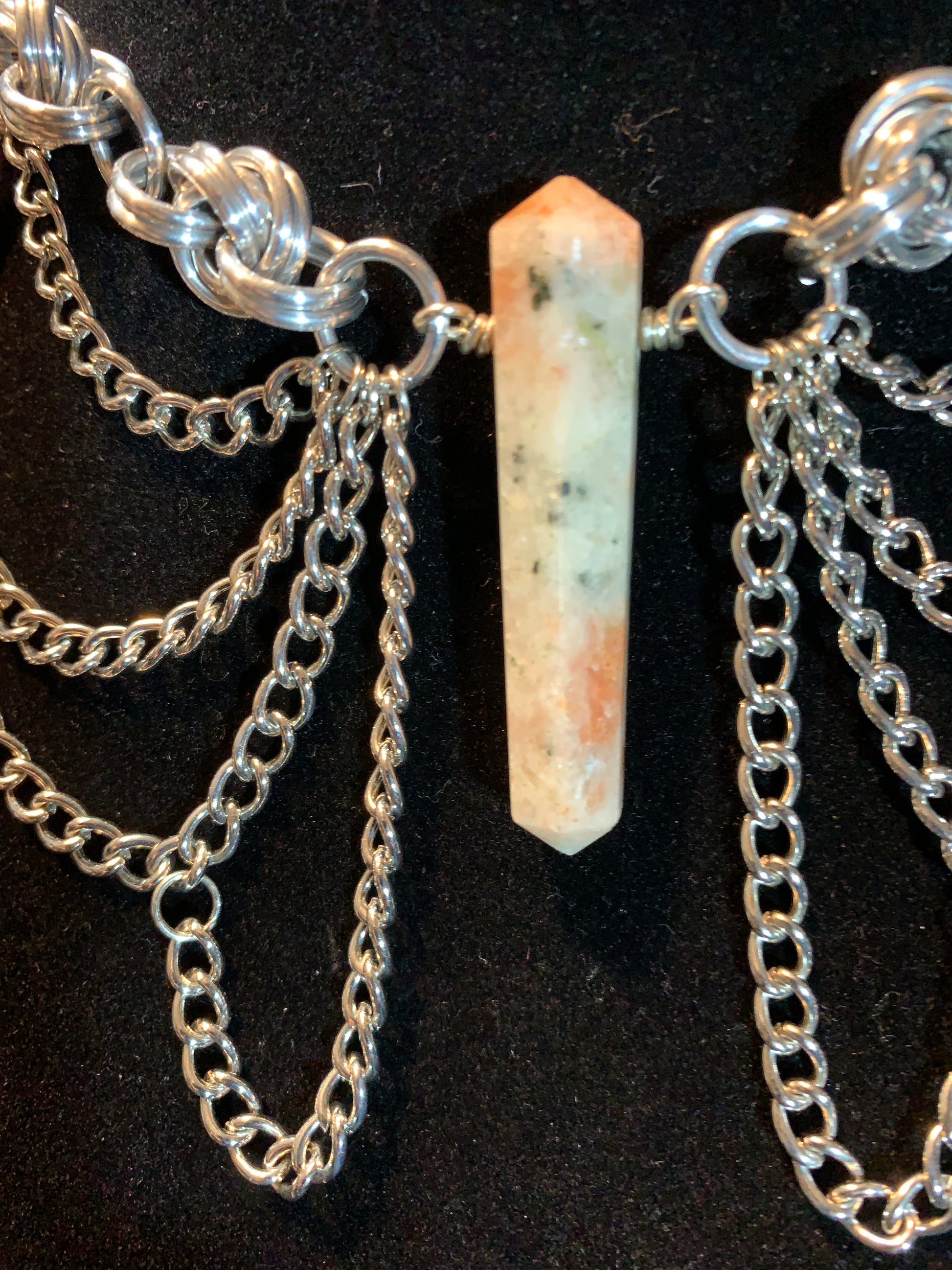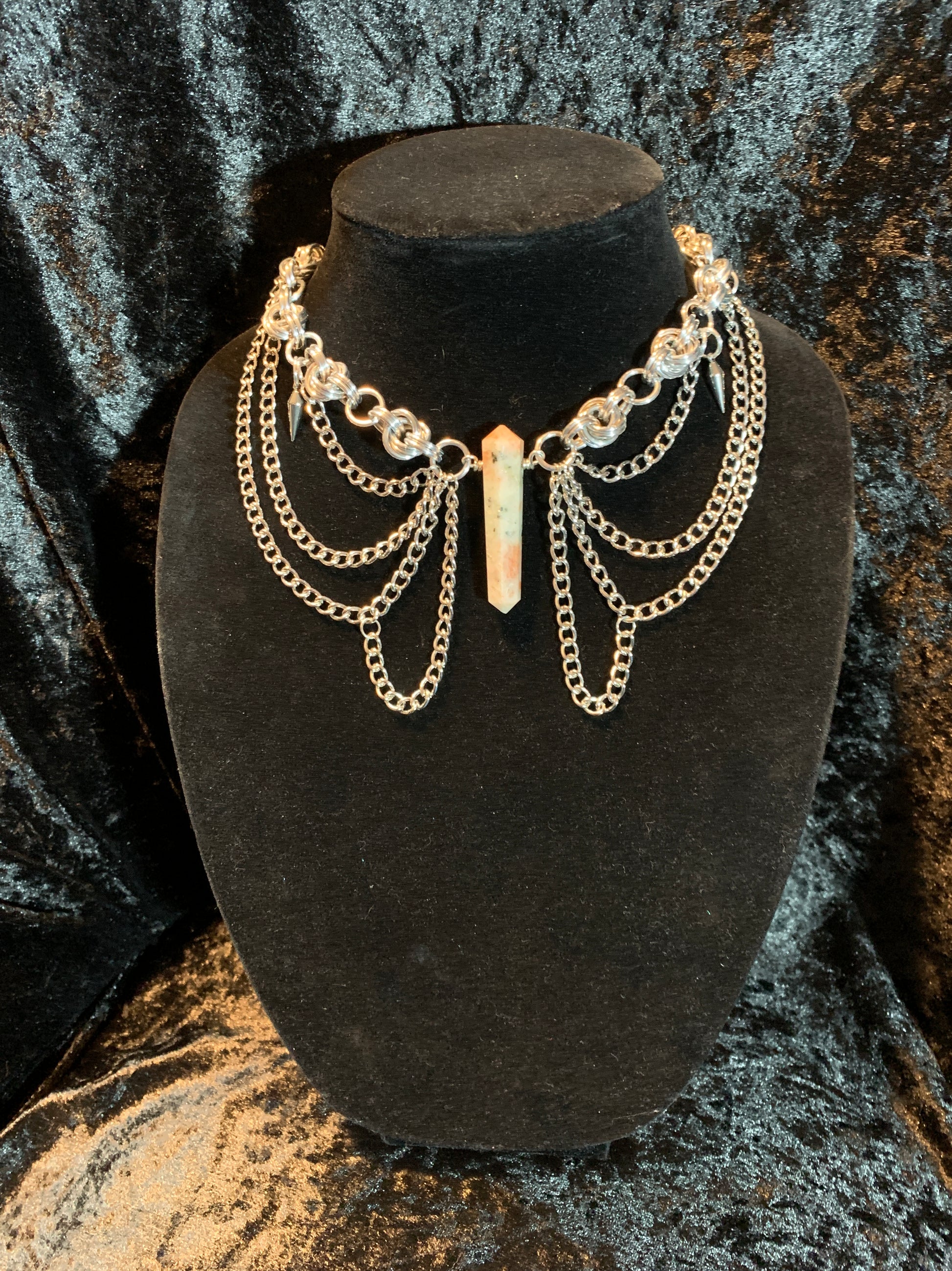 Add some sunshine to your outfit with The Monarch Sun! This quirky aluminum chainmail choker features a beautiful, natural, sunstone centerpiece, a couple of stainless steel spikey pendants, and chain details that resemble a butterfly. The sunstone is known for instilling joy, promoting self-expression, and can even recharge in the sunlight. Let your true self shine with this statement piece!