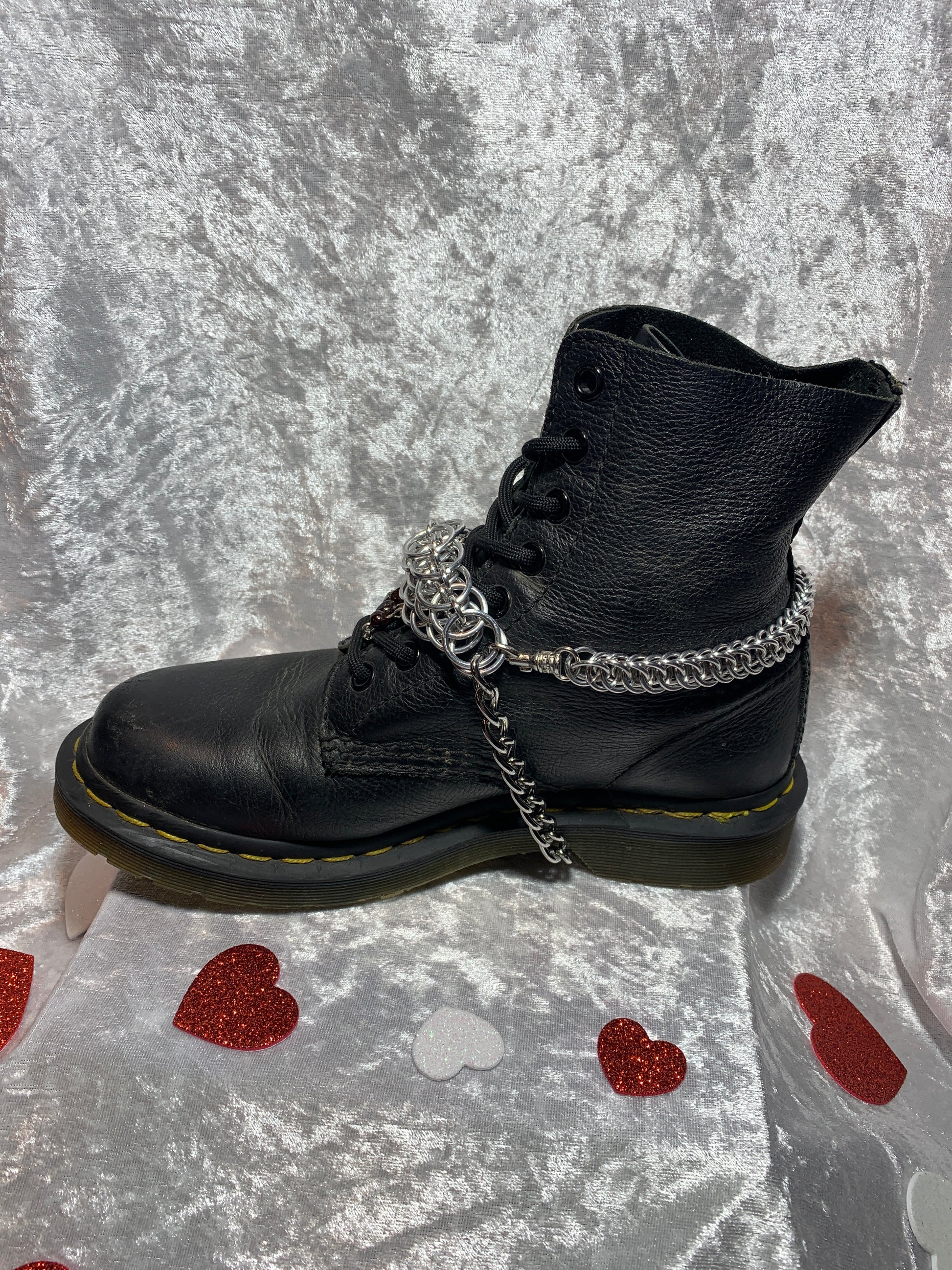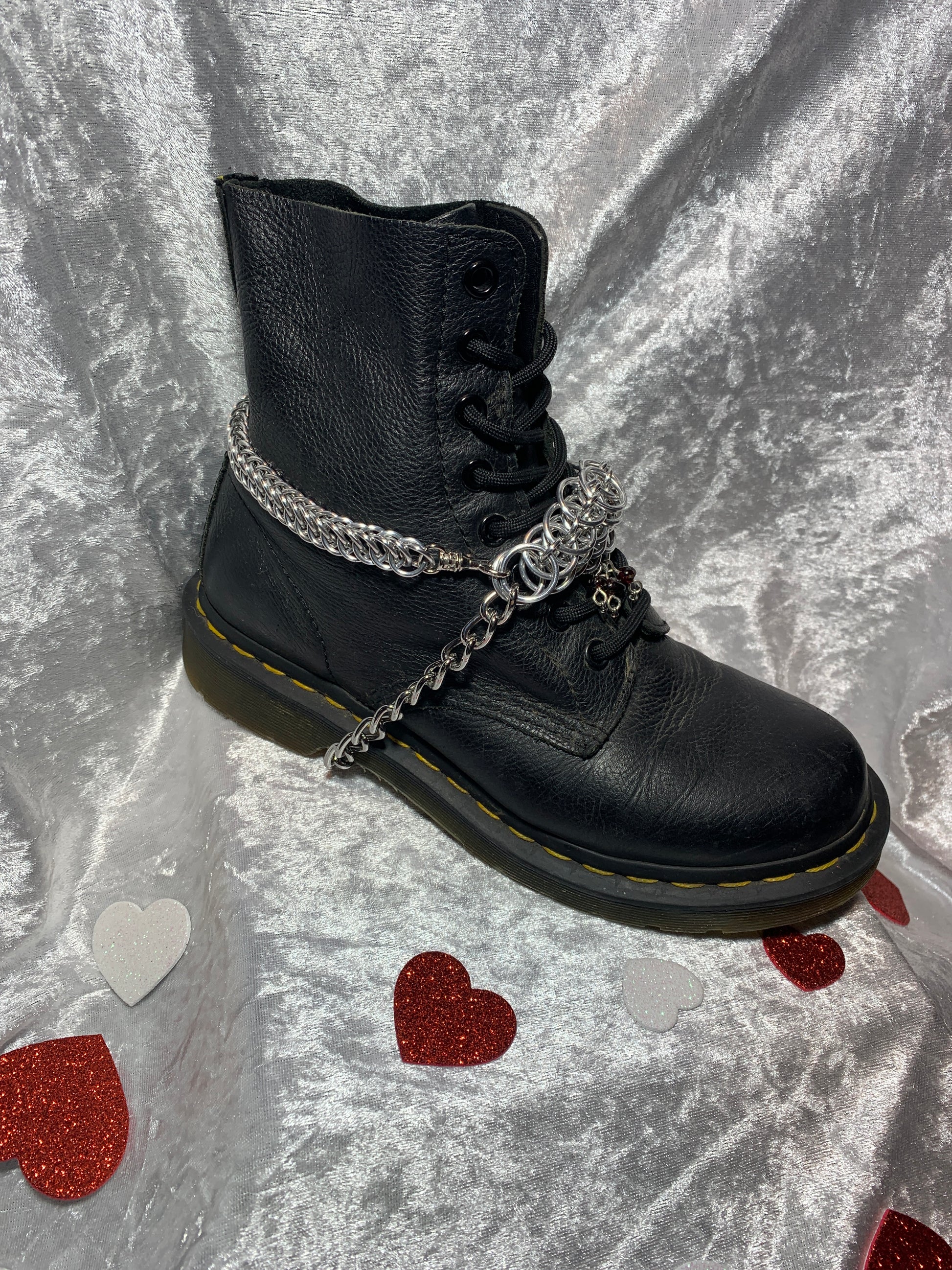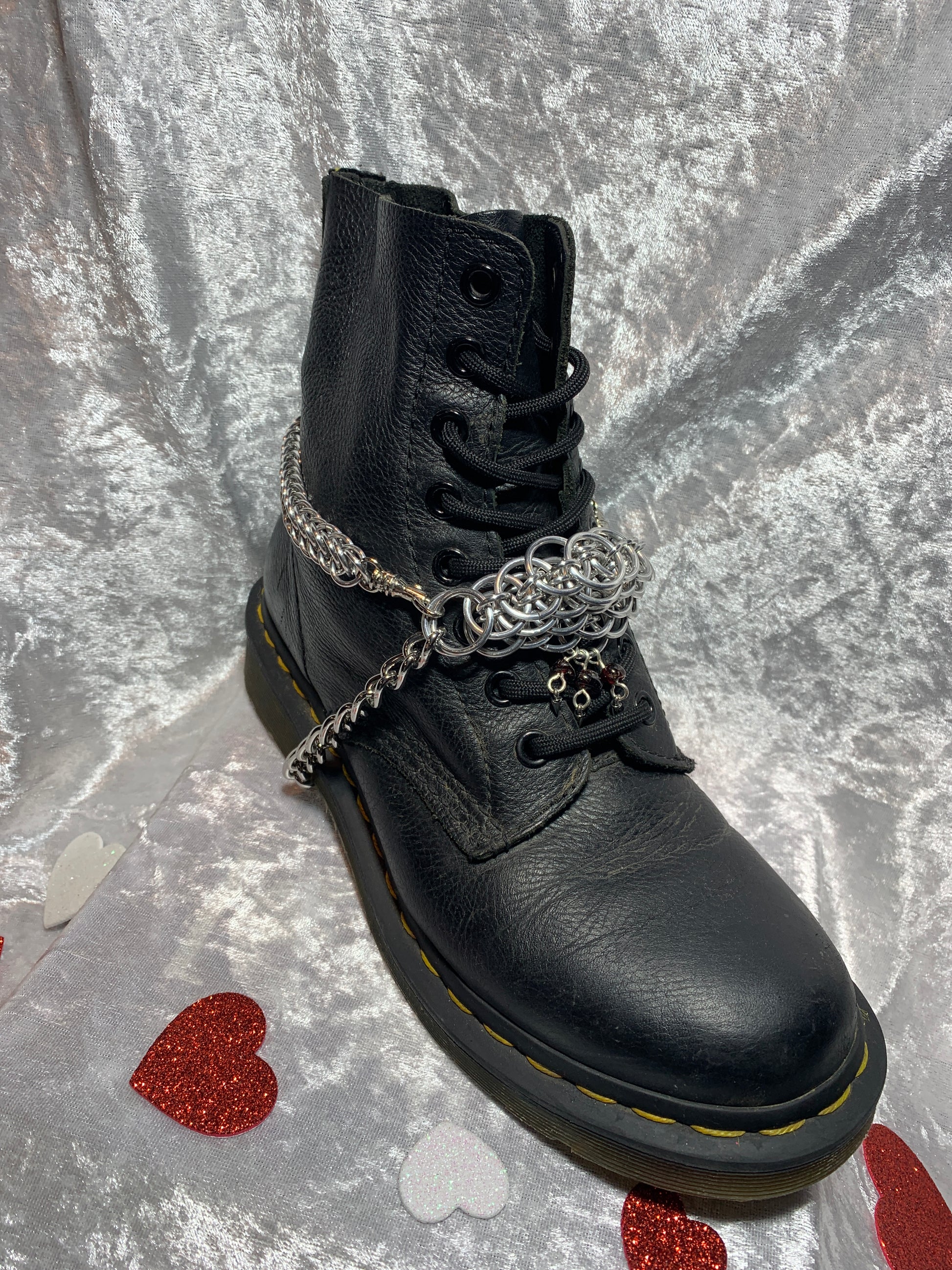 The Dragónsito Bootstrap boasts a unique design with dragon scale chainmail weave in the front and half Persian chainmail weave in the back. Accompanied by natural garnet nuggets and mini stainless steel spikey pendants, this boot also features a thick stainless steel chain for added flair.