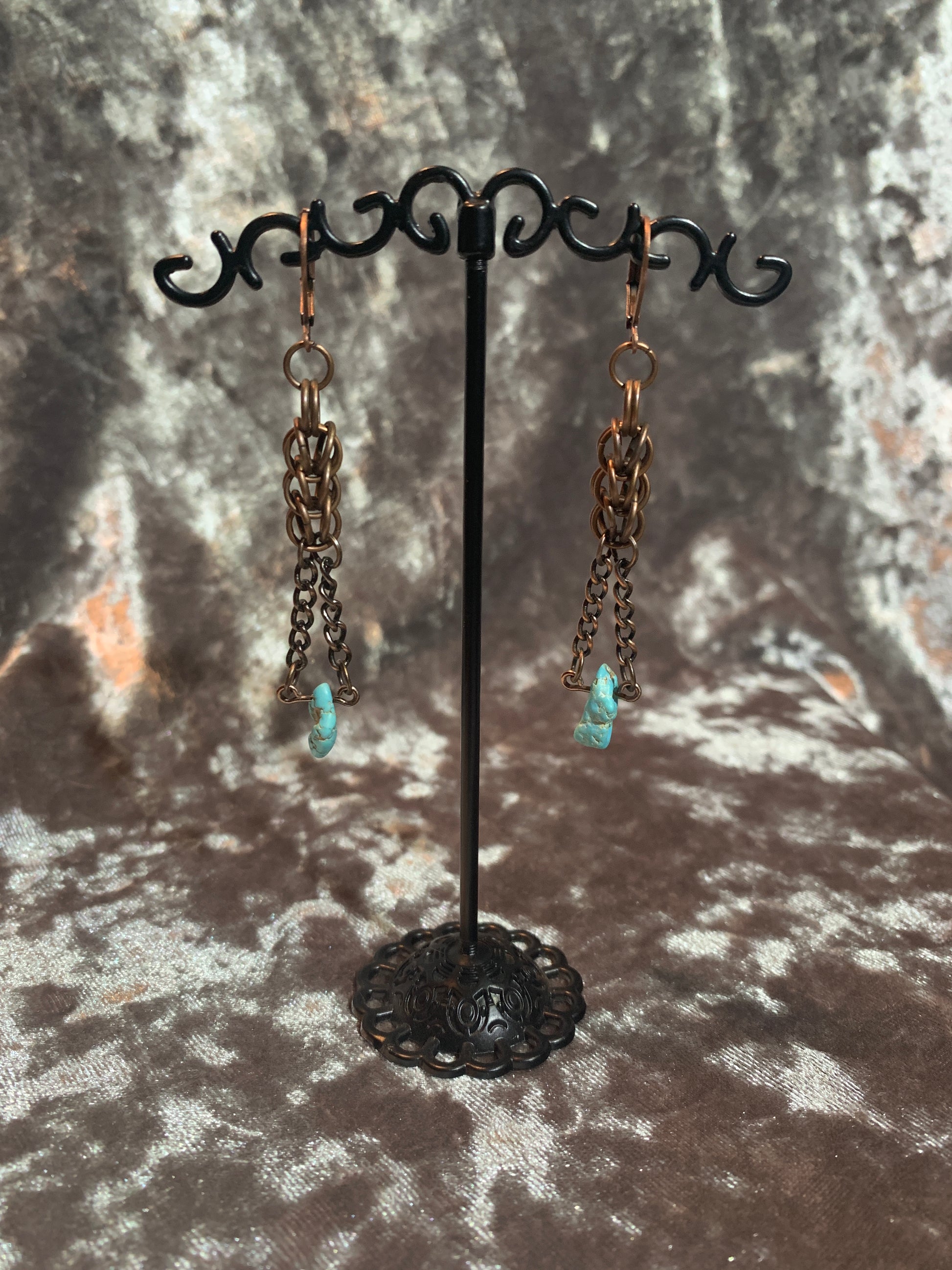 Introducing the Rattleoise earrings, featuring an antique copper full Persian chainmail weave, a couple of antique copper chains, and natural raw turquoise clusters. Protect yourself from negativity and pollutants with the power of turquoise. Don't miss out on this quirky and unique piece!