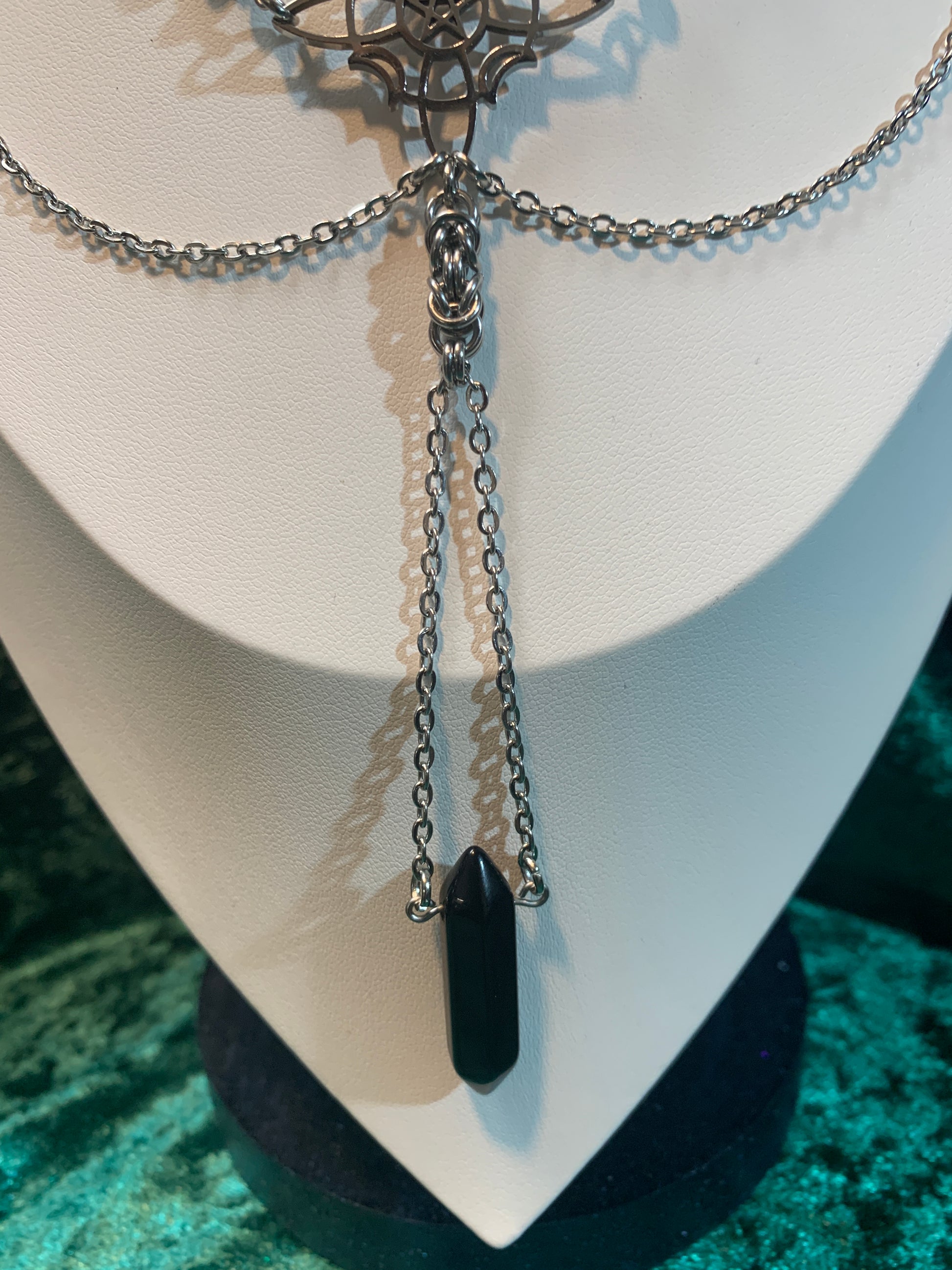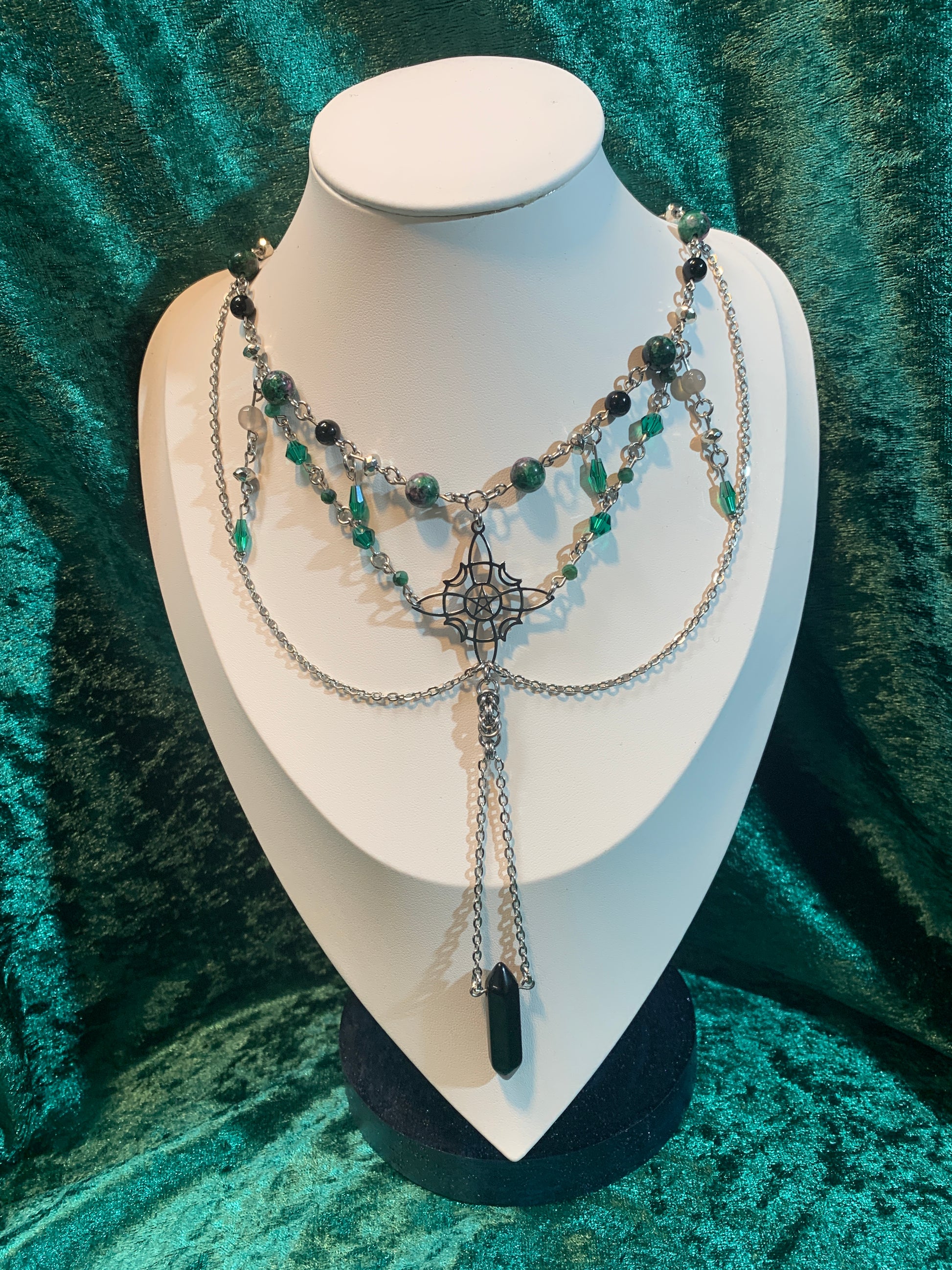 This adorable piece has natural ruby in zoisite beads for gratitude, strength, & passion. Black onyx beads for absorbing negativity to protect you and overcome challenges, some natural faceted emerald 4mm beads for enhancing unity, and promoting friendship, a couple of grey agate beads for grounding and stabilizing, and a black agate pendant to get rid of negative energy, of course also some green glass beads and faceted metal beads to give the choker a pop of color and the witches knot with a pentagram right in the middle for unity, protection, bringing the 4 elements together, and good luck! All stainless steel wire, chains and pendant, as well as a stainless steel Byzantine weave in the middle!